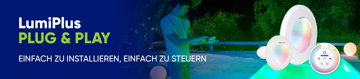 Die Einfachheit von PLUG&PLAY bietet ein völlig intuitives Beleuchtungserlebnis bei Installation und Nutzung. Einfach anschließen und loslegen. Es sind keine Installationsarbeiten im Technikraum erforderlich. Das Design des Geräts ist für eine völlig intuitive Verwendung ausgelegt. Mit nur 6 Tasten können Sie die Beleuchtung und Farbe Ihres gesamten Pools steuern.