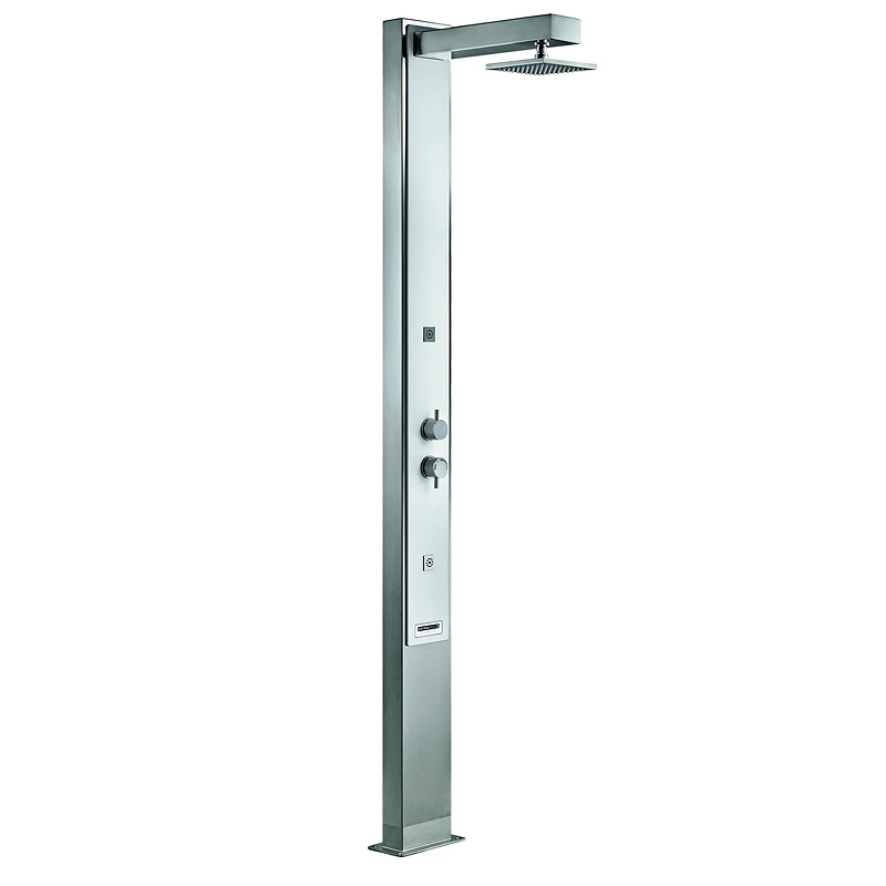 Matt AISI-316 stainless steel shower for hot and cold water with a white acrylic front panel. Adjustable chromed brass anti-limescale shower-head and 2 mist spray jets controlled by a 2-way control valve. The flow rate and the water temperature are regulated by a mixer valve.