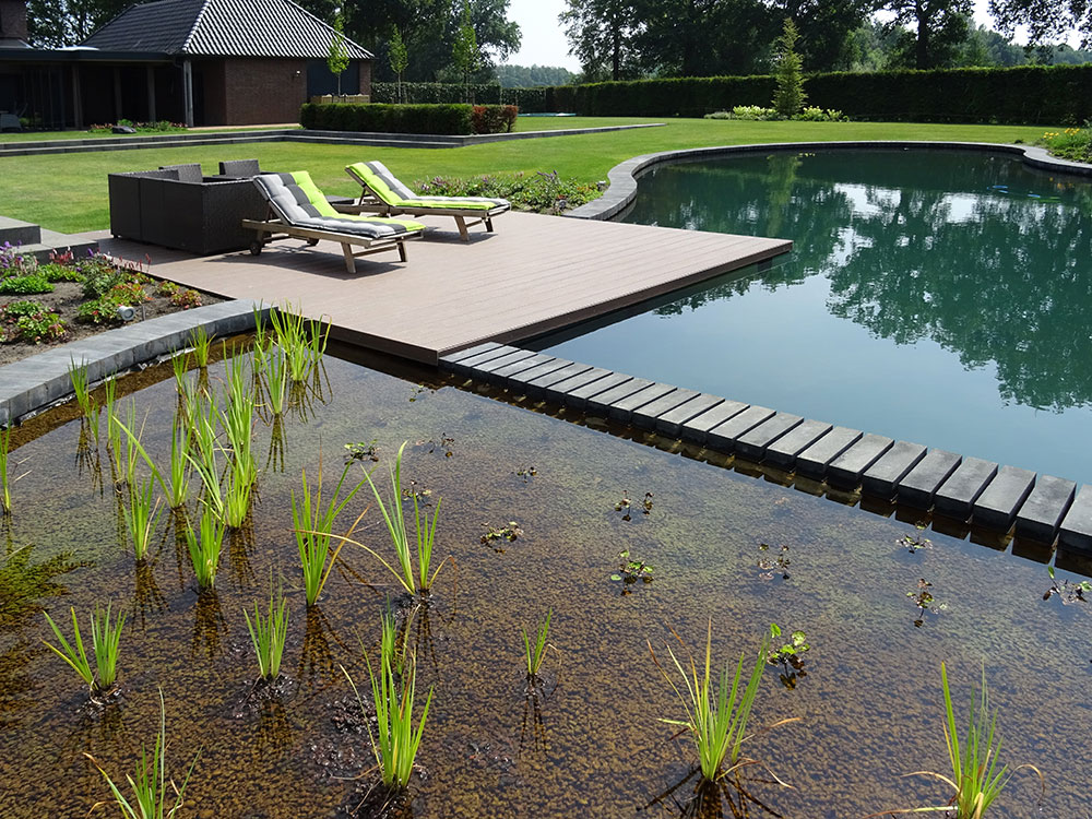 In “Crystal Clear” pools, the flora and fauna are kept separate from the pool area. They are also known as hybrid pools. This type of pool guarantees crystal clear water throughout the year thanks to the way it is built and its filtration system. It is even possible to lengthen the bathing season by adding a heat pump.