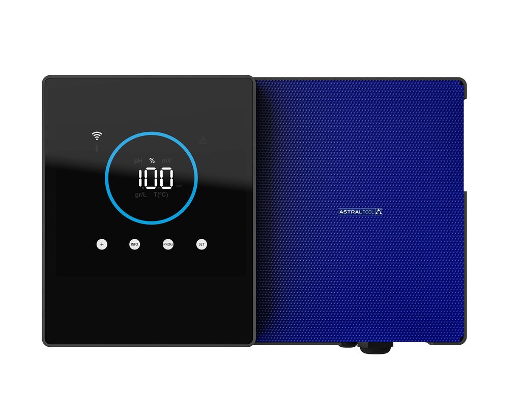 Saltwater chlorinator with modern interface, scalable and built-in connectivity. • Chlorine output (g/h): 7 / 12 / 21 / 30 / 40 • Recommended pool volume (m³): 25 / 50 / 80 / 120 / 160 • Salinity (g/L): Min. 3, Rec. 4, Max. 12 • User interface: LCD panel with touch buttons and info ring • Displayed parameters: Salinity, temperature, alarms • Scalability: Upgradeable with pH / ORP kits (scalable versions) • Production modes: Normal, Boost, Cover (adjustable) • Included Sensors: Gas detector, temperature • Optional Sensors: Flow switch, pH, ORP • Versions available: Standard, Scalable (with pH/ORP kits) • Cell cleaning: Polarity reversal (2h / 3h / 4h / 7h / test) • Cell lifetime: 8,000 hours • Cell type: Translucent • Cell position: Vertical • Hydraulic compatibility: DN50 / DN63 • Alarms & Safety: Gas sensor, flow switch, salinity, temperature, pH, Cl, cell, others • Connectivity: Wi-Fi & Bluetooth integrated + Fluidra Pool App