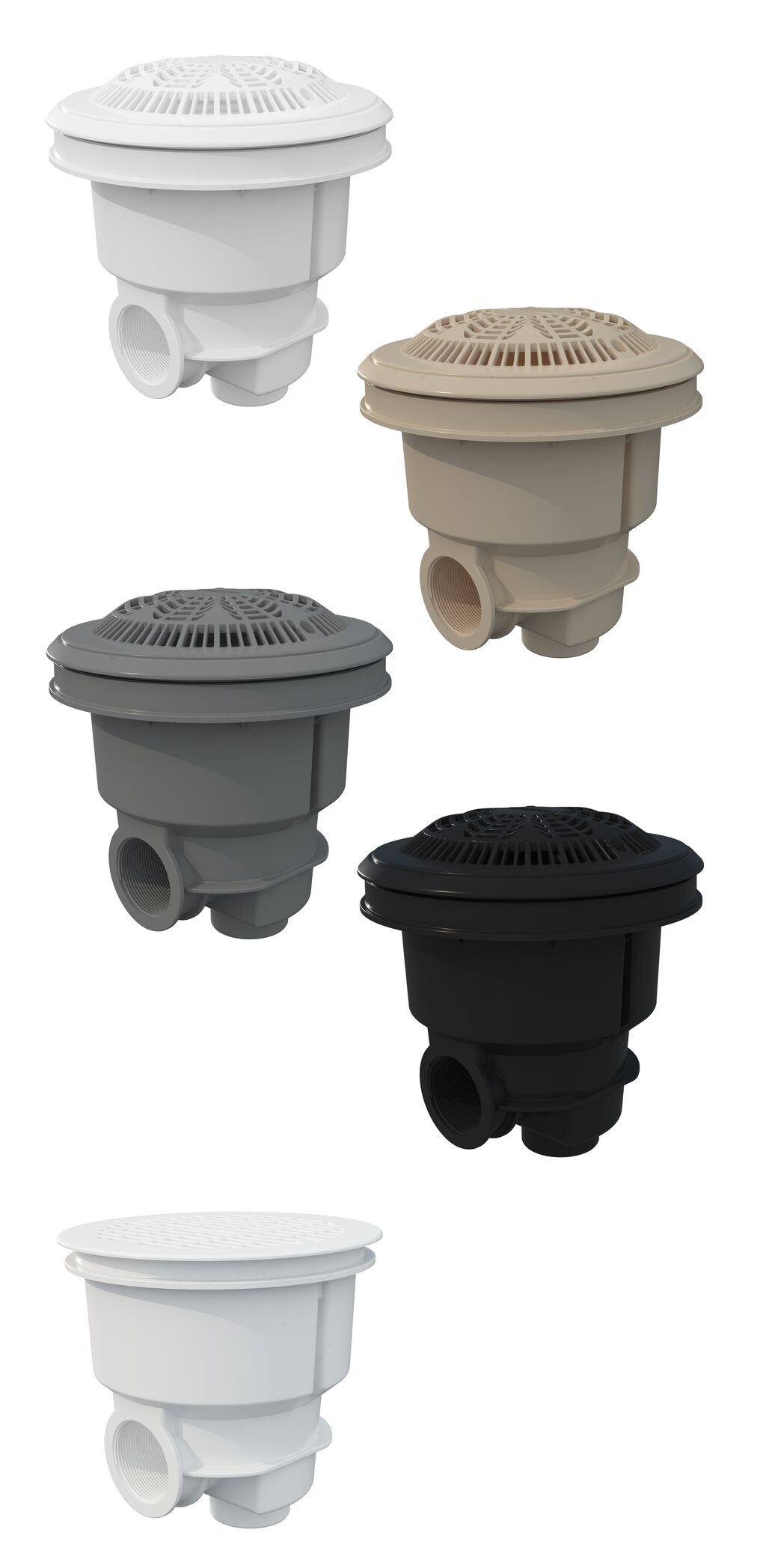 Fabriquées en ABS blanc traité contre les UV. Raccord de sortie latérale de 2" et raccord de sortie inférieure de 11/2", sortie inférieure fermée prédécoupée.
