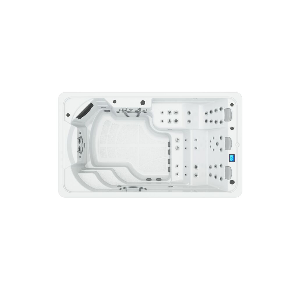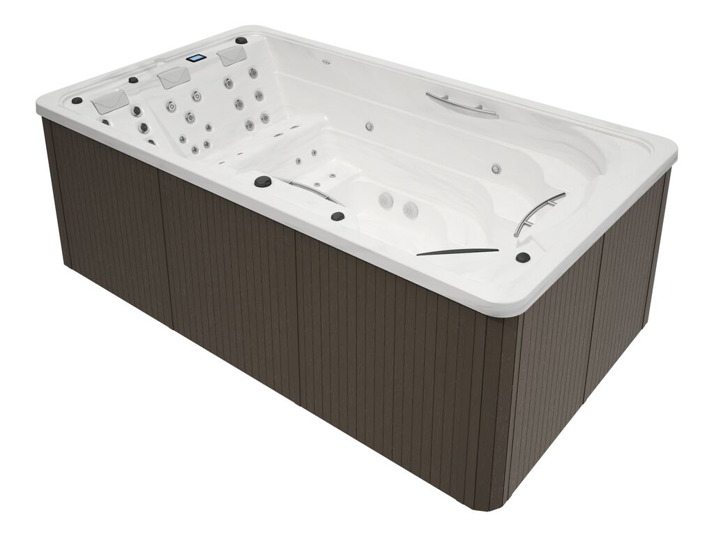 The Swismpa Creta is the perfect combination of a hot tub and a swimming pool. Designed for counter-current swimming or any aqua fitness discipline, throughout the year. The hot tub area is designed to provide an excellent hydromassage; with a lounger, two seats and a vertical hydromassage column . The bathing area has been designed both for swimming and any water sport. Accessories that set it apart The standout option for this new Swimspa is the fitness pack. This includes 3 accessories: • A pole with a harness for swimming: this accessory is easily installed on the surface of the hot tub and allows you to swim comfortably without having to worry about moving forwards and hitting the Swimspa's wall. • Elastic bands: the bands are installed using the hot tub's stainless steel bars and can be combined with different positions. • Oars: this accessory consists of two oars installed on the wall of the hot tub, with elastic bands that allow you to adjust the tension, providing excellent exercise for the upper torso area. More than a bathing area The Swimspa Creta is a space for all of the family. As it is divided into two separate areas, the kids can turn the hot tub area into a mini-swimming pool while the adults are using the other area. The swimspa allows you to heat up the water and maintain it at the desired temperature, so you can enjoy it throughout the year, whatever the temperature outside