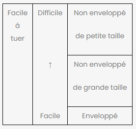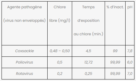 Le Schéma indique les divers degrés d’efficacité afin d’inactiver différents virus et agents pathogènes. Les Coxsackievirus, Poliovirus et Rotavirus sont des virus non enveloppés. On peut constater qu’ils sont inactivés à une valeur Ct de chlore inférieure à 15 mg-min/l. (La valeur Ct est le résultat de la concentration d’un désinfectant (tel que le chlore libre) et du temps de contact dans l’eau traitée).