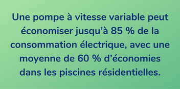 Remplacer une pompe de piscine traditionnelle par une pompe à vitesse variable est l'un des moyens les plus simples d'augmenter l'efficacité énergétique globale de la piscine. En moyenne, elles sont 85 % plus efficaces que les pompes traditionnelles à vitesse unique.