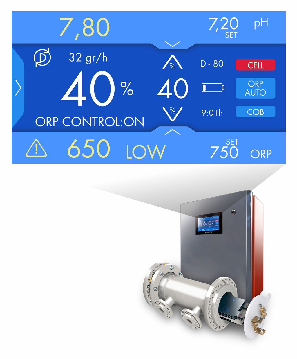Nature Salt Plus products have a sustainable cycle through the removal of chloramines, running through 2 grams of salt per liter and no chemical treatment. Self-Cleaning commercial salt electrolysis system for use in public pools use up to 300 gr. chlorine / hour. TWIN-CELL Cell high pressure SYSTEM equipped with electrodes EX quality. Extending control functions using optional extensions.